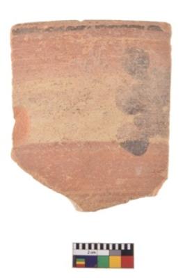 | Description / विवरण | A specimen of a potsherd. It is reddish in colour with black decorative geometric painting on it. |