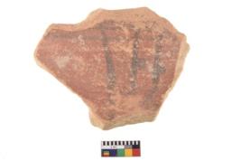 | Description / विवरण | A specimen of a potsherd. It is reddish in colour with black decorative geometric painting on it. |