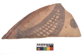 | Description / विवरण | A specimen of a potsherd. It is reddish in colour with black decorative geometric painting on it. |