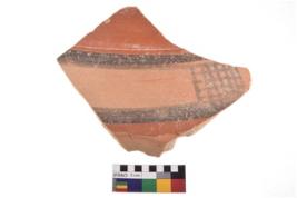 | Description / विवरण | A specimen of a potsherd. It is reddish in colour with black decorative geometric painting on it. |