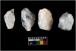 | Description / विवरण | Specimen of cores with weathered cortex and several broad fluted marks. Some of them are irregular in shape, whereas some are tapering at one end. |