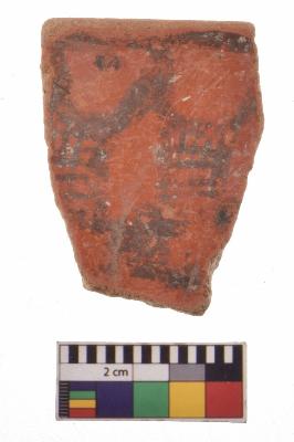 | Description / विवरण | Specimen of black on red ware with decorative geometric Groups of vertical net pattern painting. |