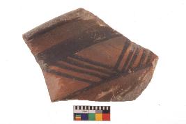 | Description / विवरण | Specimen of potsherd with black decorative geometric Linear painting, Type Black on Red Ware . |