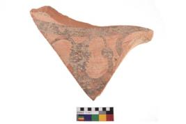 | Description / विवरण | A specimen of a potsherd. It is reddish in colour with black decorative geometric painting on it. |
