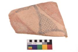 | Description / विवरण | A specimen of a potsherd. It is reddish in colour with black decorative geometric painting on it. |