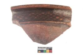| Description / विवरण | Specimen of potsherd black on red painted pottery. It is fine fabric in sharp contrast with painted design are executed in black pigment. |