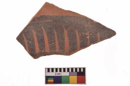 | Description / विवरण | Specimen of black on red ware with decorative geometric Broad vertical strokes set in two horizontal bands painting. |