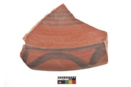 | Description / विवरण | A specimen of a potsherd. It is reddish in colour with black decorative geometric painting on it. |