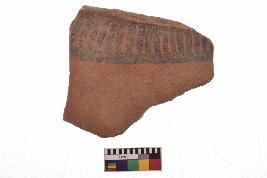 | Description / विवरण | Specimen of black on red ware with decorative geometric Vertical strokes set in two horizontal bands painting. |
