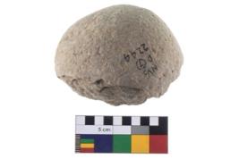 | Description / विवरण | A Hammer stone roughly rounded in shape with grounded edges. |