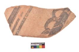| Description / विवरण | A specimen of a potsherd. It is reddish in colour with black decorative geometric painting on it. |