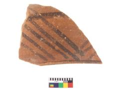 | Description / विवरण | A fragment of a potsherd. It is reddish in colour with black decorative geometric painting on it. |