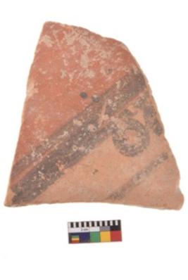| Description / विवरण | A specimen of a potsherd. It is reddish in colour with black decorative geometric painting on it. |