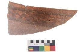 | Description / विवरण | Specimen of potsherd black on red painted pottery. It is fine fabric in sharp contrast with painted design are executed in black pigment. |
