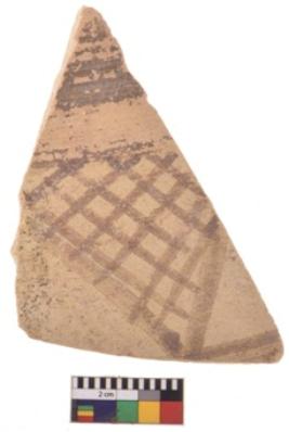 | Description / विवरण | A specimen of a potsherd. It is reddish in colour with black decorative geometric painting on it. |