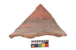 | Description / विवरण | A specimen of a potsherd. It is reddish in colour with black decorative geometric painting on it. |