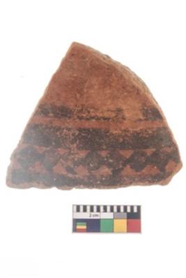 | Description / विवरण | Specimen of potsherd with black decorative geometric diamond set broad horizontal bands painting . |