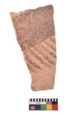 | Description / विवरण | A specimen of a potsherd. It is reddish in colour with black decorative geometric painting on it. |