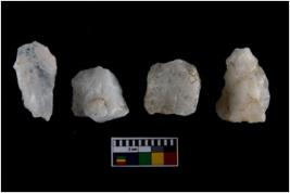 | Description / विवरण | Specimen of cores with weathered cortex and several broad fluted marks. |