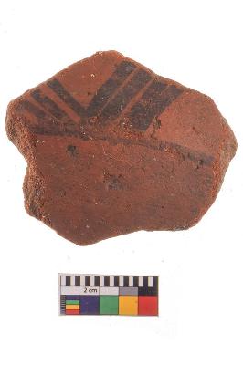 | Description / विवरण | Specimen of potsherd with black decorative geometric Linear painting, Type Black on Red Ware . |