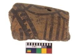 | Description / विवरण | A fragment of a potsherd. It is reddish in colour with black decorative geometric painting on it. |