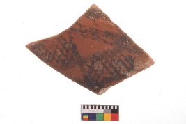 | Description / विवरण | Specimen of potsherd with black decorative geometric Diamond set broad horizontal bands painting, Type Black on Red Ware . |