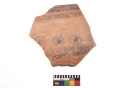 | Description / विवरण | A specimen of a potsherd. It is reddish in colour with black decorative geometric painting on it. |