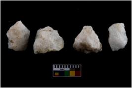 | Description / विवरण | Specimen of cores with weathered cortex and several broad fluted marks. |