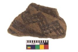 | Description / विवरण | A fragment of a potsherd. It is reddish in colour with black decorative geometric painting on it. |