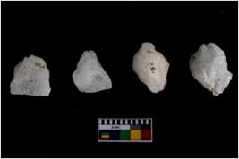 | Description / विवरण | Specimen of cores with weathered cortex and several broad fluted marks. |