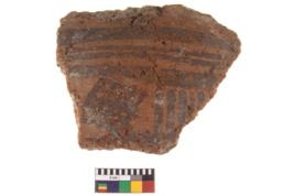 | Description / विवरण | A fragment of a potsherd. It is reddish in colour with black decorative geometric painting on it. |
