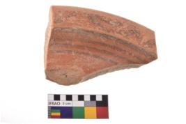 | Description / विवरण | A specimen of a potsherd. It is reddish in colour with black decorative geometric painting on it. |