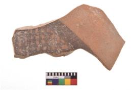 | Description / विवरण | A specimen of a potsherd. It is reddish in colour with black decorative geometric painting on it. |