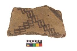| Description / विवरण | A fragment of a potsherd. It is reddish in colour with black decorative geometric painting on it. |