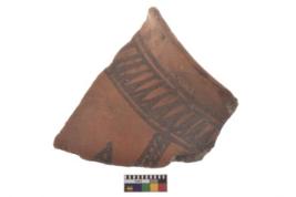| Description / विवरण | Specimen of black on red ware with black decorative Parallel spikes and line intersecting circles geometric painting. |