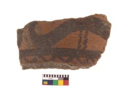 | Description / विवरण | A fragment of a potsherd. It is reddish in colour with black decorative geometric painting on it. |