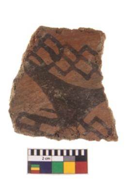 | Description / विवरण | A fragment of a potsherd. It is reddish in colour with black decorative geometric painting on it. |