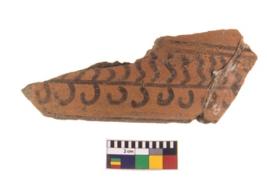 | Description / विवरण | A fragment of a potsherd. It is reddish in colour with black decorative geometric painting on it. |