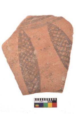 | Description / विवरण | A specimen of a potsherd. It is reddish in colour with black decorative geometric painting on it. |