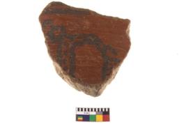 | Description / विवरण | A fragment of a potsherd. It is reddish in colour with black decorative animal painting on it. |