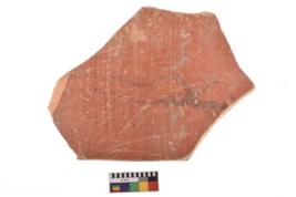 | Description / विवरण | A specimen of a potsherd. It is reddish in colour with black decorative geometric painting on it. |