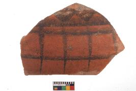 | Description / विवरण | Specimen of potsherd with black decorative geometric Diamond set broad horizontal bands painting, Type Black on Red Ware . |