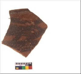 | Description / विवरण | A fragment of a potsherd. It is reddish in colour with black decorative geometric painting on it. |