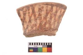 | Description / विवरण | A specimen of a potsherd. It is reddish in colour with black decorative geometric painting on it. |