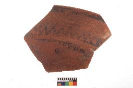 | Description / विवरण | Specimen of potsherd with black decorative geometric Set of two zigzag bands painting, Type Black on Red Ware . |