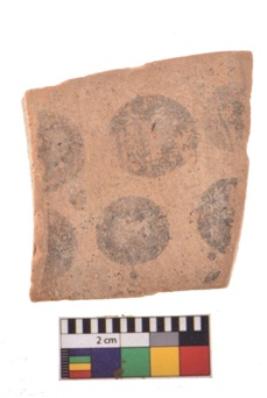 | Description / विवरण | A specimen of a potsherd. It is reddish in colour with black decorative geometric painting on it. |