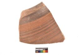 | Description / विवरण | A specimen of a potsherd. It is reddish in colour with black decorative geometric painting on it. |