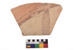 | Description / विवरण | A specimen of a potsherd. It is reddish in colour with black decorative geometric painting on it. |