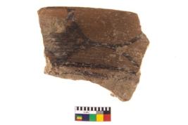 | Description / विवरण | A fragment of a potsherd. It is reddish in colour with black decorative geometric painting on it. |