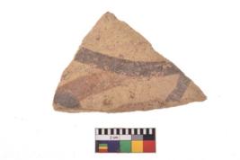 | Description / विवरण | A specimen of a potsherd. It is reddish in colour with black decorative geometric painting on it. |